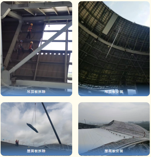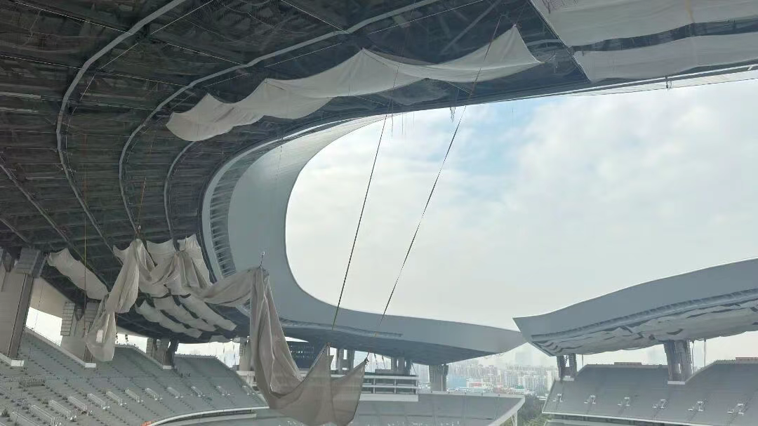 奥体中心的双曲飘带屋盖,是何镜堂院士笔下 "岭南气质" 的建筑表达,也是此次改造的核心难点。二十余年风雨侵蚀带来的锈蚀、漏水等难题,让原有屋面分段拼接的局限渐显,与国际赛事的高标准需求形成差距。雅百特以 "修旧如旧更胜旧" 的理念,开启了这场高空之上的精工修缮。