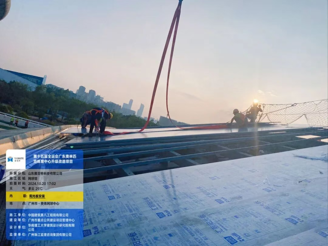 针对岭南日照强烈的气候特点,项目团队选用高透光、抗紫外线的阳光板材料,既为赛场引入充足自然光,又能有效阻隔烈日暴晒,为运动员创造舒适的竞技环境。安装时特别优化拼接工艺,板与板的拼接处采用密封胶与泡沫条双层防护,既防止雨水渗漏,又减少热胀冷缩带来的变形。