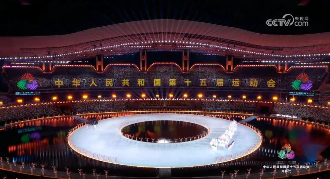 开幕式当晚,当蓝色灯光铺满舞台 “海面”,膜面将光影晕染成流动的星河,与场地中 “珠江汇流” 的虚实影像相映成趣,让技术成为光影艺术的隐形载体。