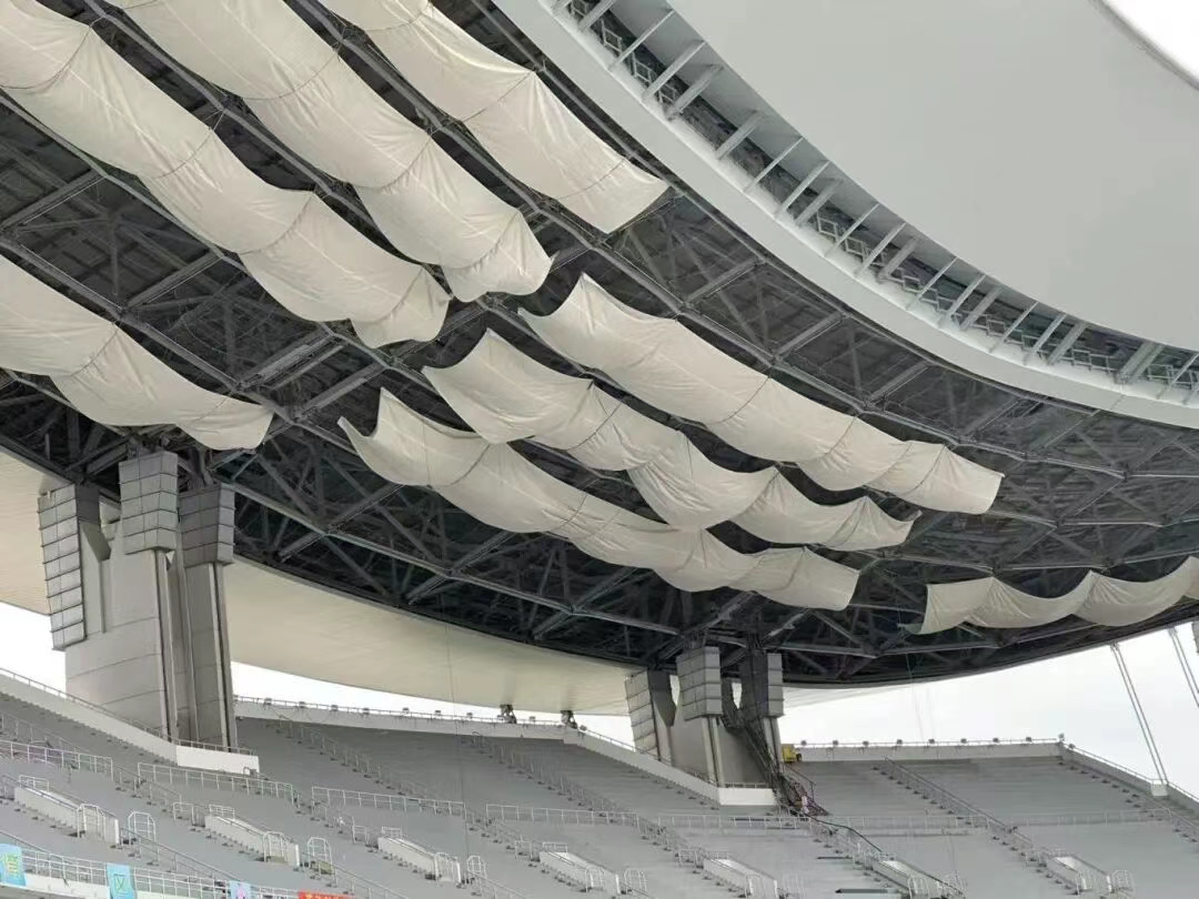 当《沧海一声笑》的旋律在赛场回荡,武术演员溅起的水花在灯光下晶莹剔透,观众席上空的PTFE吊膜如月光幕布般,将光影演绎成流动的艺术盛宴——这背后正是雅百特对膜结构技术的精准把控:考虑到原有桁架无可用连接节点,项目团队采用抱箍连接方式,通过定制与主体结构紧密固定,既避免破坏原有钢结构,又为膜材张拉提供稳固支撑,每一处抱箍的安装角度都经力学计算,确保在风雨中保持稳定。