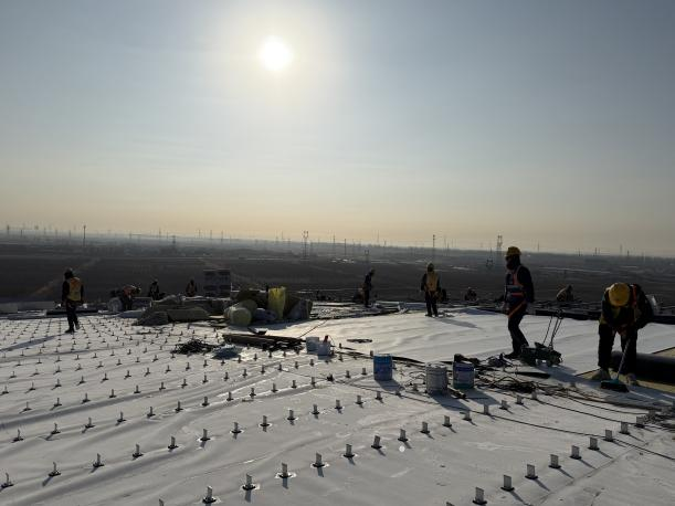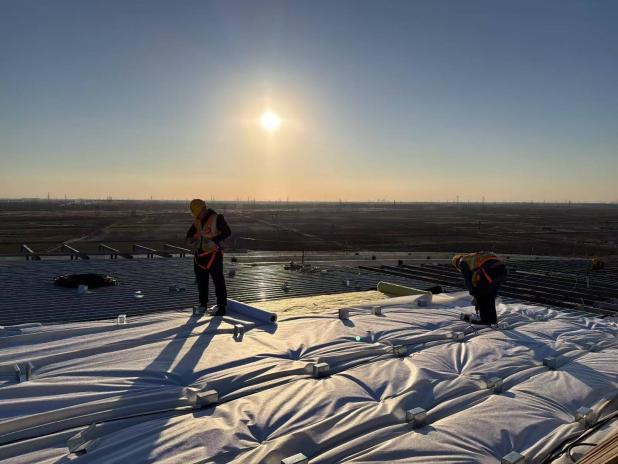冬季的寒意、复杂的施工流程、严苛的安全规范,都没有阻挡攻坚的脚步。雅百特项目团队提前规划、科学调配,将冬季低温、作业环境复杂等挑战转化为精细化施工的动力:从檩条吊装的精准定位,到底板安装的严丝合缝,从保温层与防水层的细致铺设,到龙骨拼装的高效衔接,各工序协同发力,技术人员全程驻场破解难题,稳步推进项目建设。